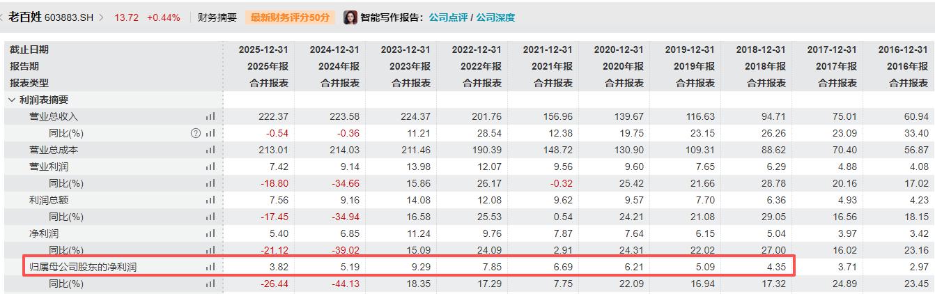 数据显现,2025年,老百姓完成运营收入222.37亿元,同比削减0.54%;归属于上市公司股东的净利润(下称“归母净利润”)3.82亿元,同比削减26.44%。
